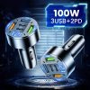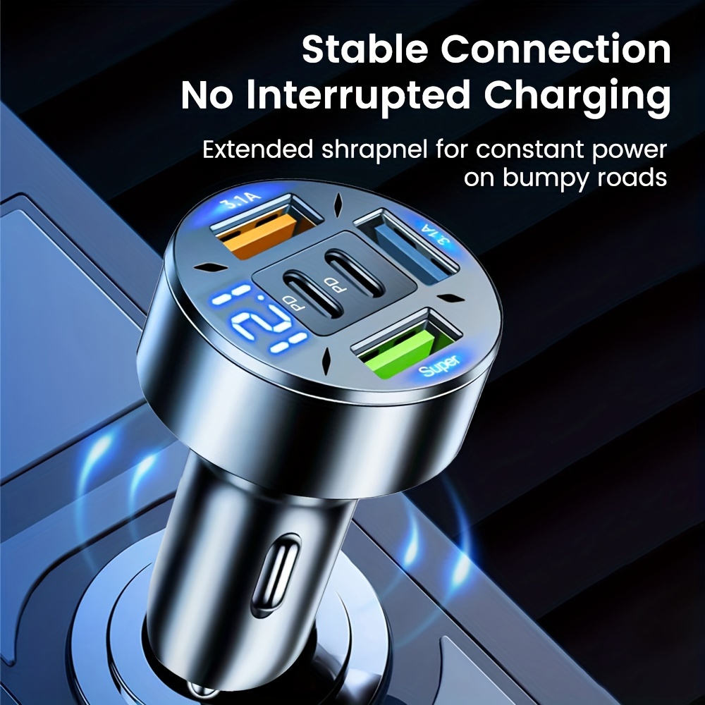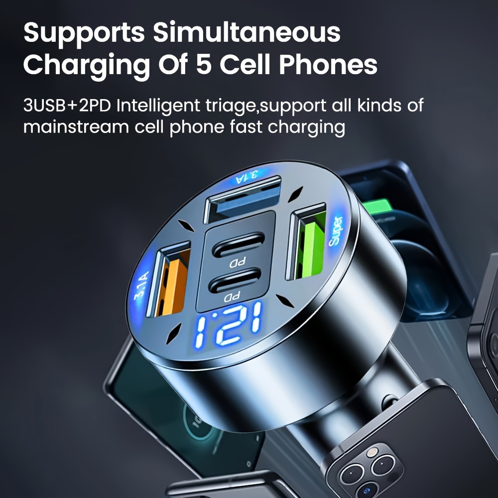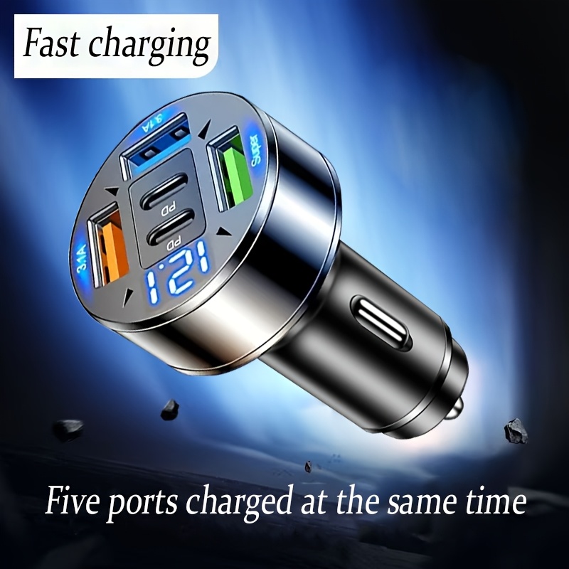 100W Rapid Charging Car Charger with Digital Screen, 2PD And 3 USB-C Ports, Universal Car Plug for Phones And Tablets, Without Battery.